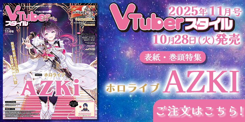 TOP 2025.10.27 2022.10.28 「星街すいせい」武道館ライブ再演 情報解禁!on 2025年11月14日 at 1:09 PM にじさんじから「ゆかいなパンやさん」グッズを2025年11月19日(水)19時からにじストアにて販売開始!on 2025年11月14日 at 1:00 AM にじさんじから「共通衣装3Dグッズ vol.2」グッズが登場!2025年11月14日(金)19時から販売開始!on 2025年11月13日 at 10:00 AM by PR TIMES Tweets by VTuber_style 【VTuberスタイル 2025年11月号】 ホロライブ AZKi NEW EP リリース & ソロライブ 開催記念 【10月28日(火)発売!】 【VTuberスタイル 2025年10月号】 にじさんじ Idios 1st Mini Albumリリース&1st LIVE開催記念 【9月27日(土)発売!】 【VTuberスタイル 2025年9月号】 XrossStars 注目の最新TCGリリース記念大特集 【8月28日(木)発売!】 【VTuberスタイル 2025年8月号】 ホロライブ 夏のホロライブ特集号 付録:ホロナツパラダイスビジュアルポスター 【7月28日(月)発売!】 【VTuberスタイル 2025年7月号】 にじさんじ 甲斐田晴 デジタルアルバム『MAGIC』リリース記念インタビュー掲載 【6月27日(金)発売!】 【VTuberスタイル 2025年6月号】 WeatherPlanet デビュー記念独占インタビュー掲載 【5月28日(水)発売!】 【VTuberスタイル 2025年5月号】 にじさんじ 伏見ガク デビュー7周年&6月21日1stソロイベント開催 【4月28日(月)発売!】 【VTuberスタイル 2025年4月号】 ななしいんく グループ統合2周年記念 所属メンバー座談会 【3月28日(金)発売!】 【VTuberスタイル 2025年3月号】 ライブイベント “Odd Play-Off” 2月22日開催 にじさんじ EXゲーマーズ 【2月28日(金)発売!】 【VTuberスタイル 2025年2月号】 1st LIVE “Dynamic VOLT” 2月23日開催! にじさんじ VOLTACTION 【1月28日(火)発売!】 Follow @VTuber_style